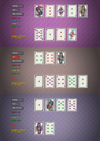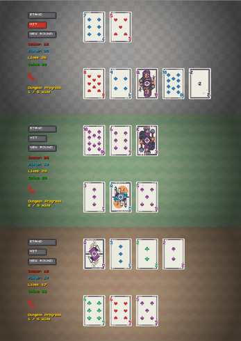 - Blackjack-based combat with custom cards (e.g. negative cards with decrease values and hidden cards with unknown values)