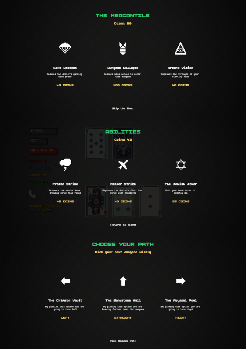 "Busted" is a 2D roguelike dungeon crawler built around blackjack. You'll explore a deep dungeon, clear rooms, and try to survive as you go deeper each run. Pick up new abilities, discover shops with rule-breaking effects, and adapt as the game throws new twists at you. More content is planned before release.